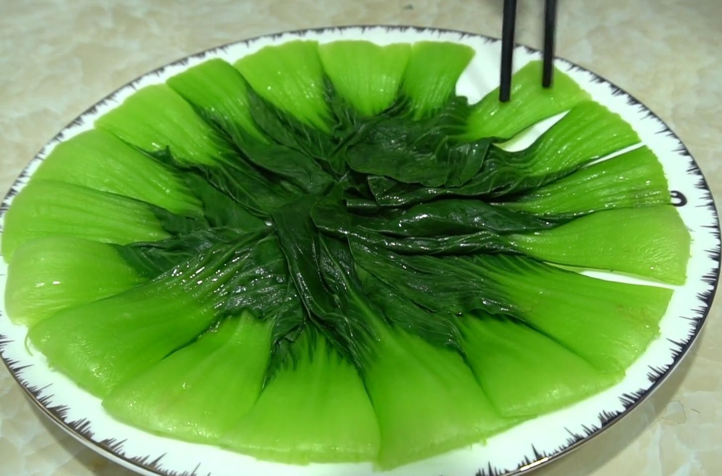 8,准备好油菜清洗干净,起锅烧水,水开后加入一勺食盐下入油菜焯水1分钟,控水捞出摆放在盘中备用。