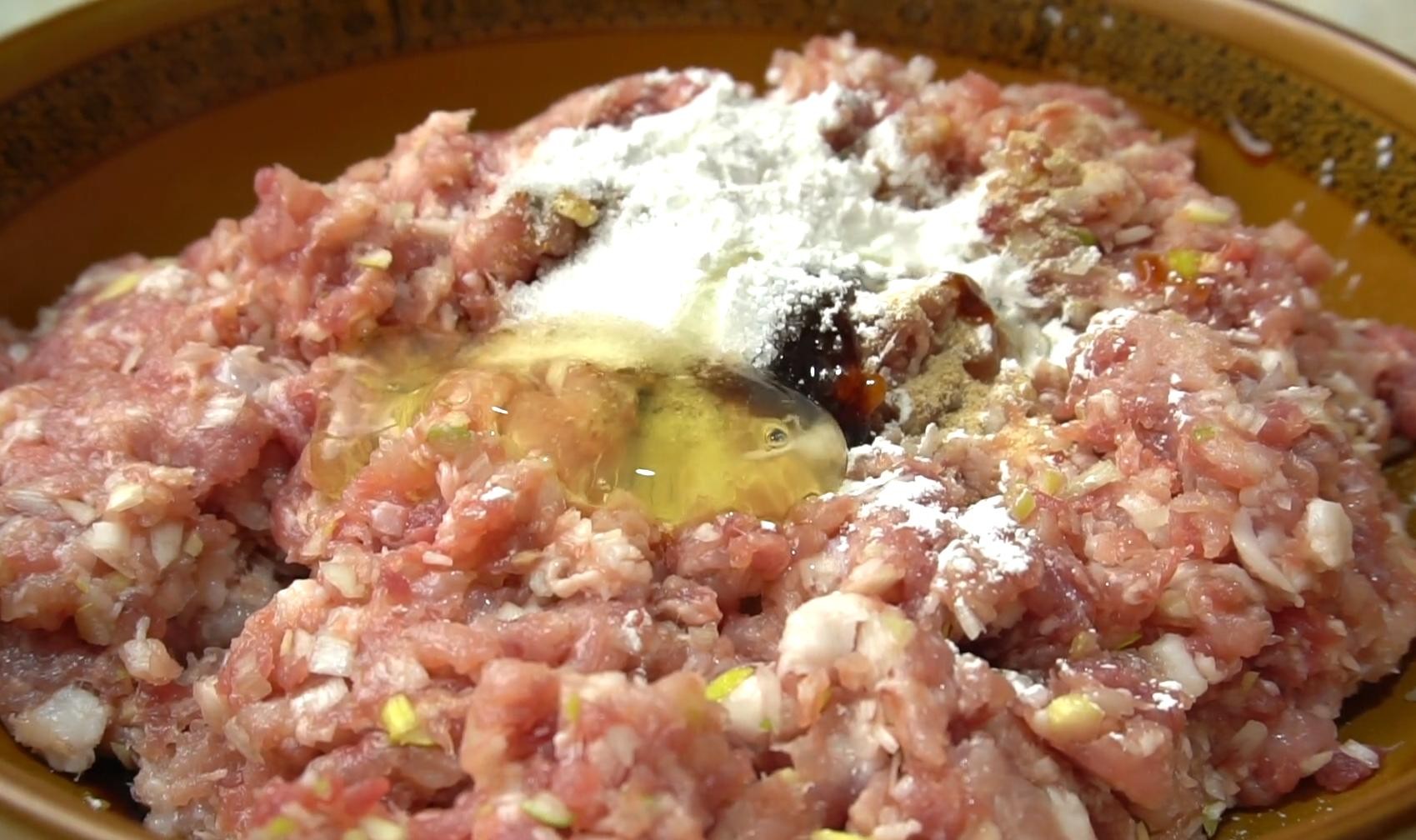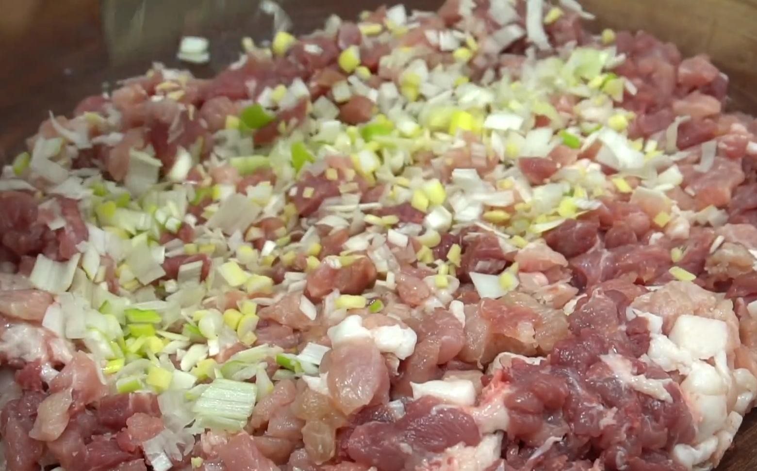 1,准备好两斤三分肥七分瘦的猪肉切成小丁,再准备好一根大葱,一块生姜切碎,和切好的猪肉丁放在一起剁成肉泥,这样可以使猪肉充分的吸收葱姜的香味。