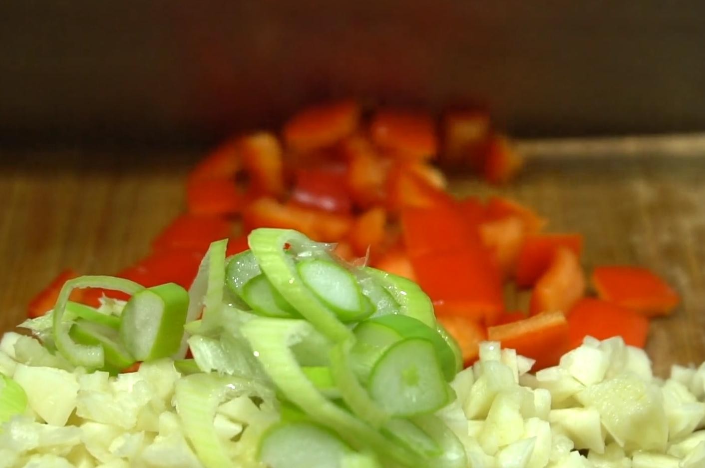 7,准备好一头大蒜切成蒜末,大葱切沫,一个红青椒切碎备用。