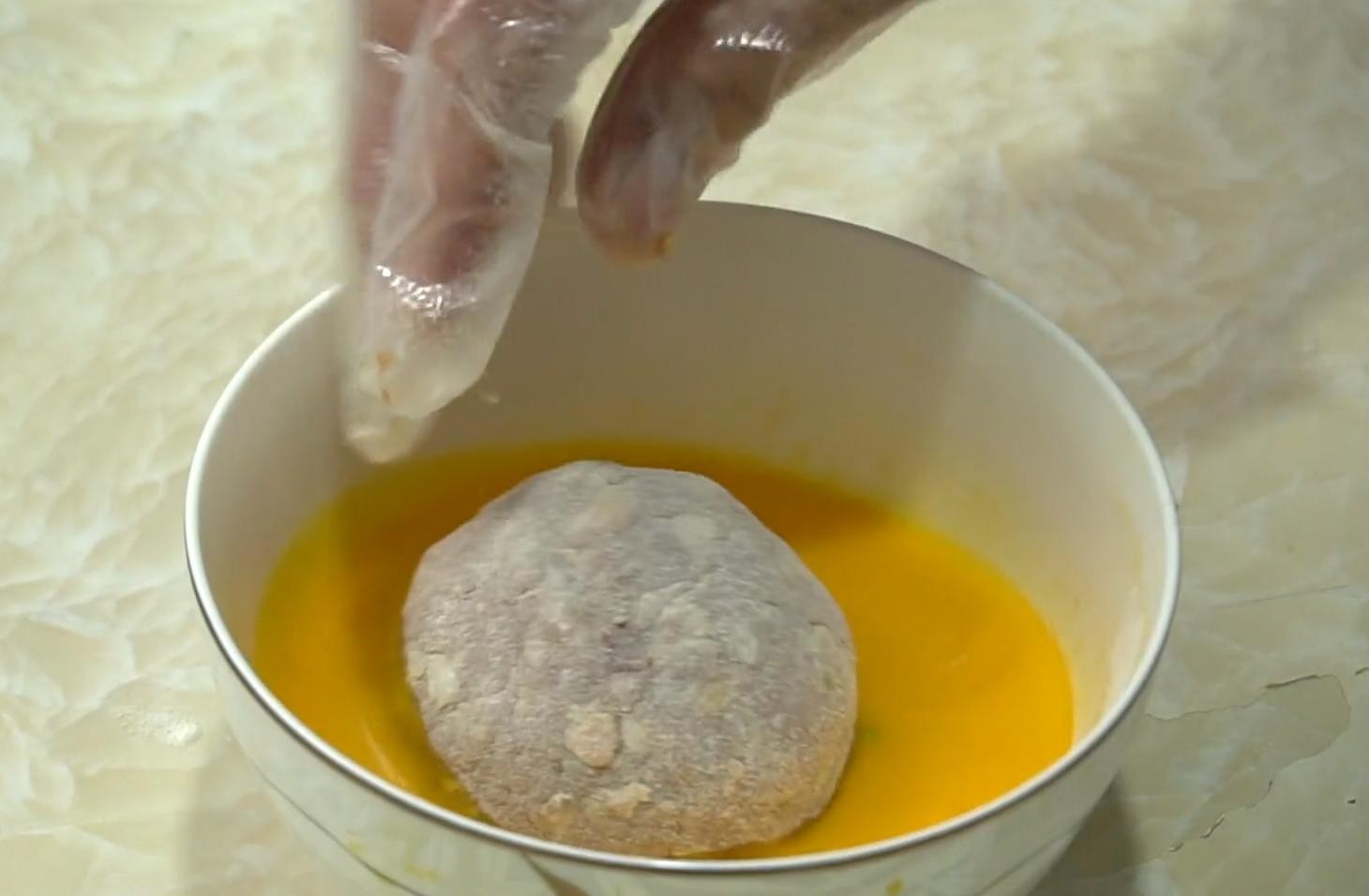 3,10分钟后揪出一团肉馅,左右手来回地摔打整理成一个大号的肉丸子,做好的丸子先裹上一层面粉,再裹上一层蛋液,最后再次裹上一层面粉。