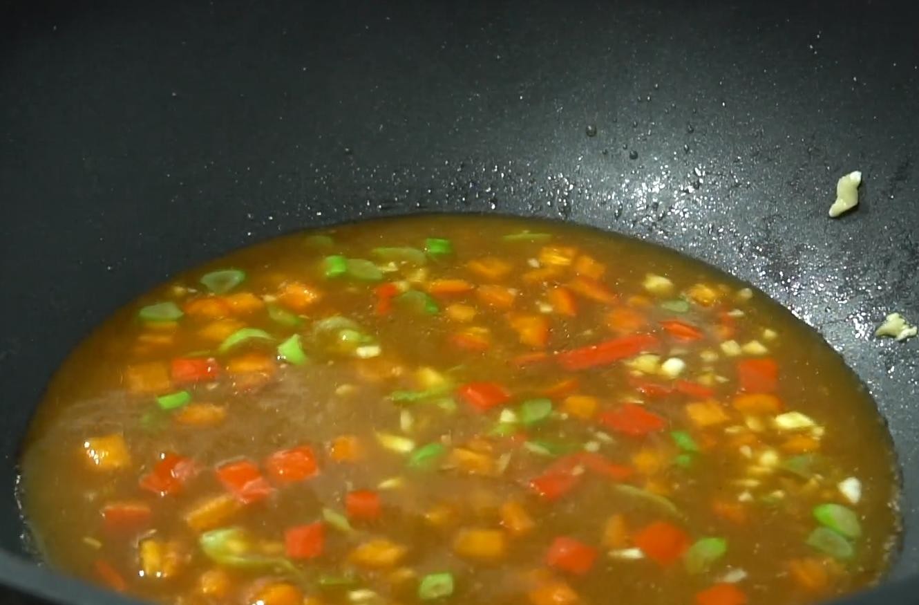 9,锅中倒入少许食用油,下入切好的蒜末,葱花,红青椒炒出香味,再倒入调好的料汁,小火慢熬,熬到汤汁变得有一点黏稠关火。
