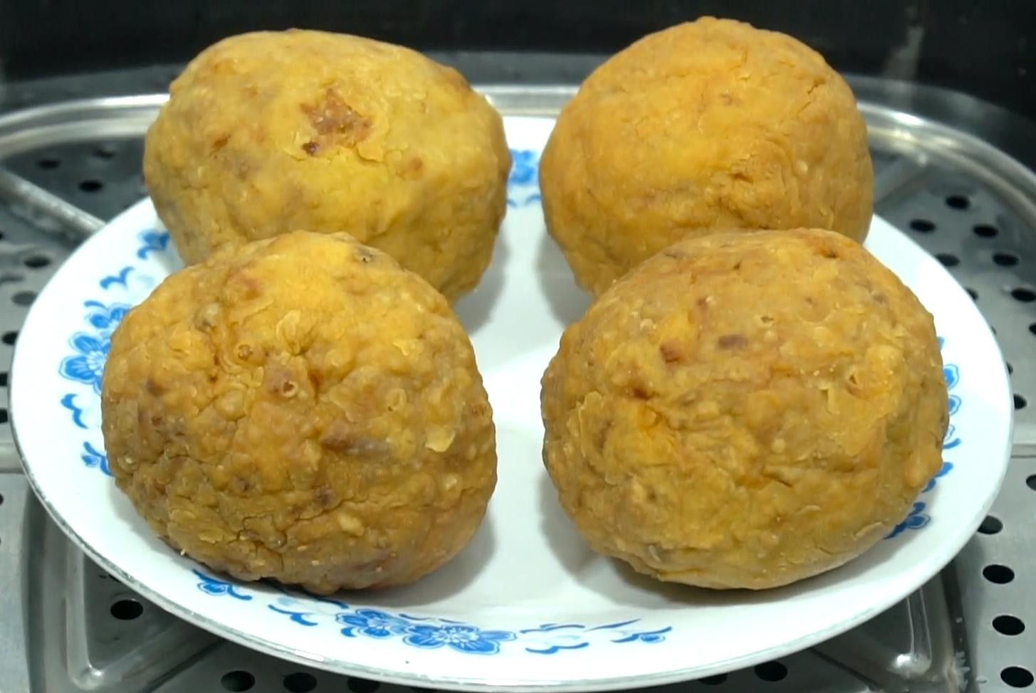 5,炸好的丸子放入盘中,冷水放入蒸锅,大火烧开后蒸15分钟。