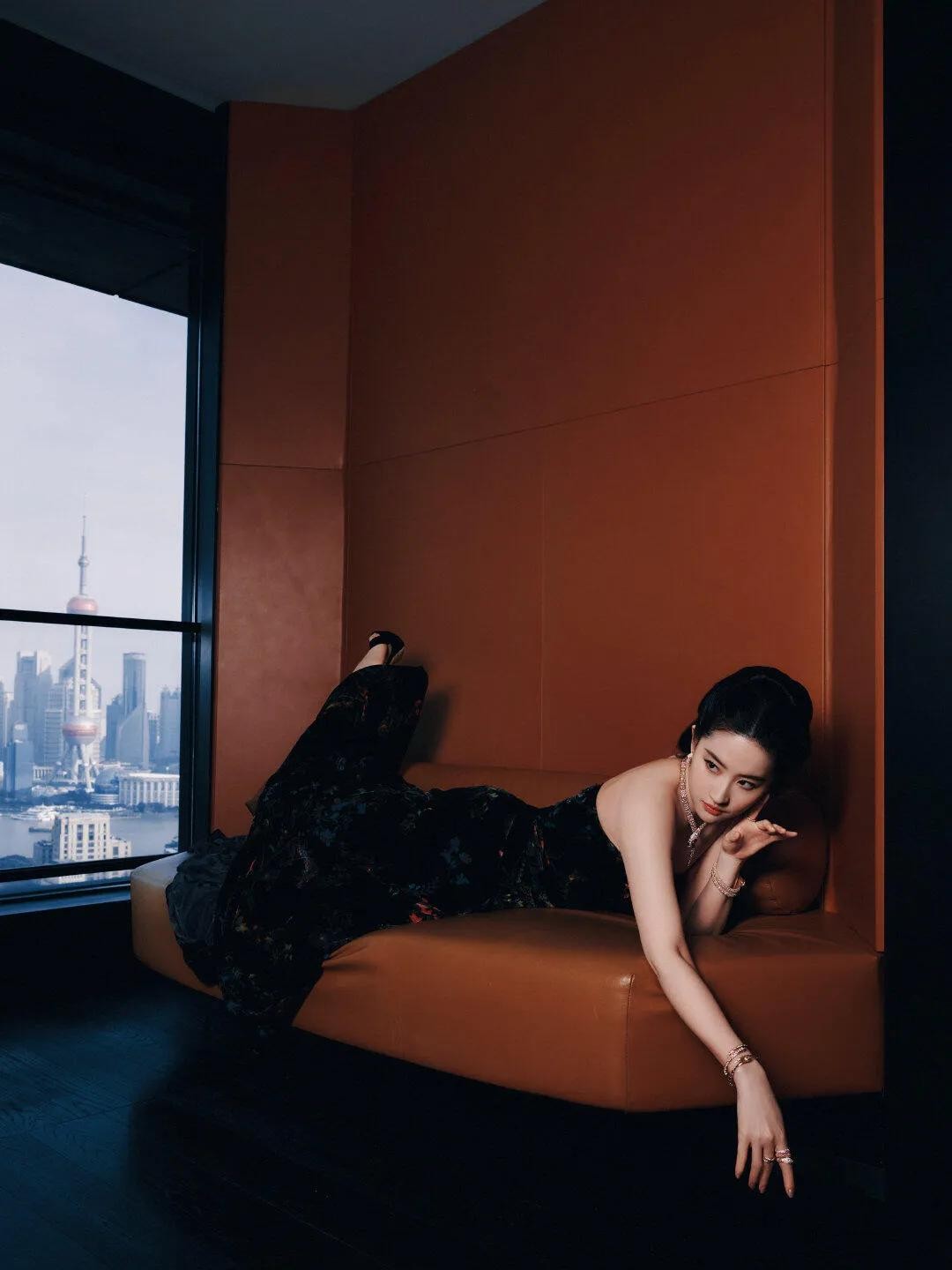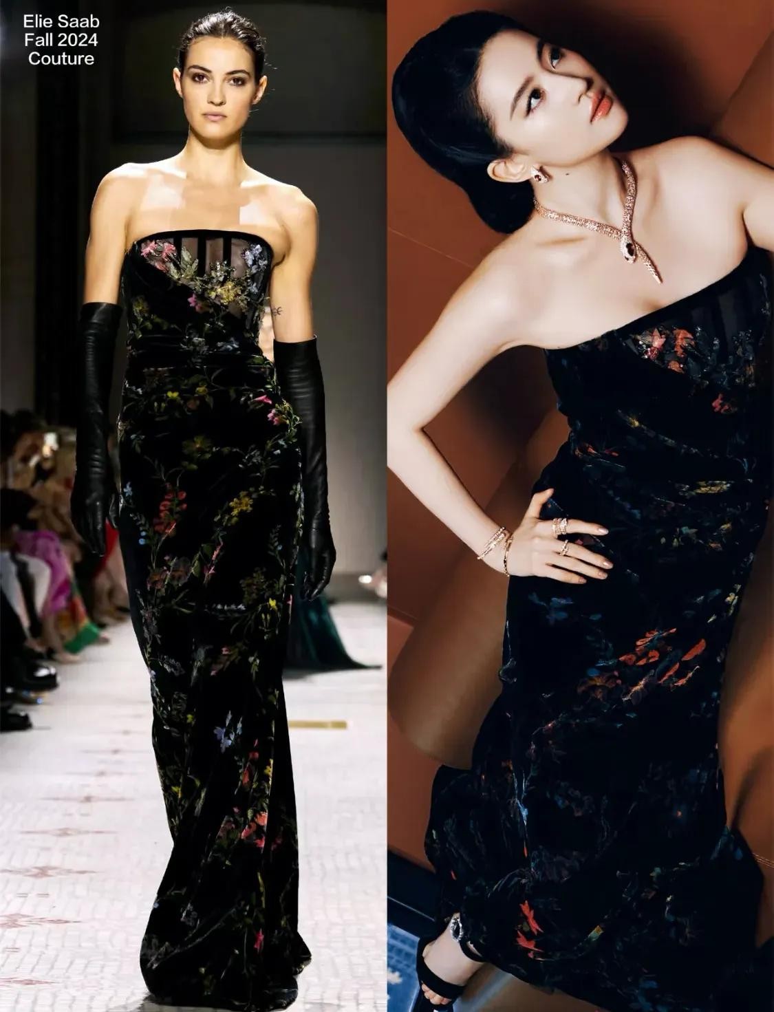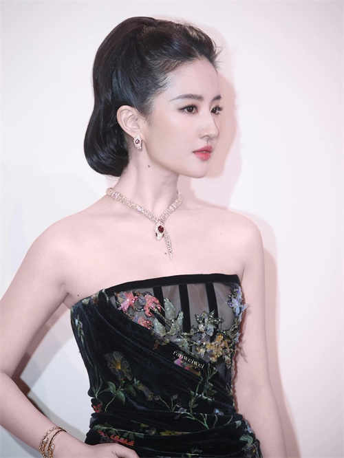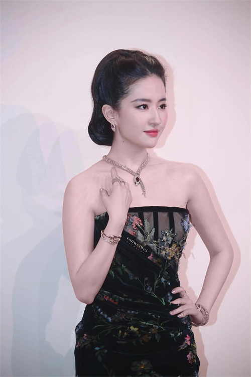 刘亦菲在这场宝格丽活动上换了两件礼服。她穿这件Elie Saab的黑丝绒印花礼服很大气,她在演绎伊甸园里魅惑的夏娃,灵蛇在她颈肩和手腕间游走。
