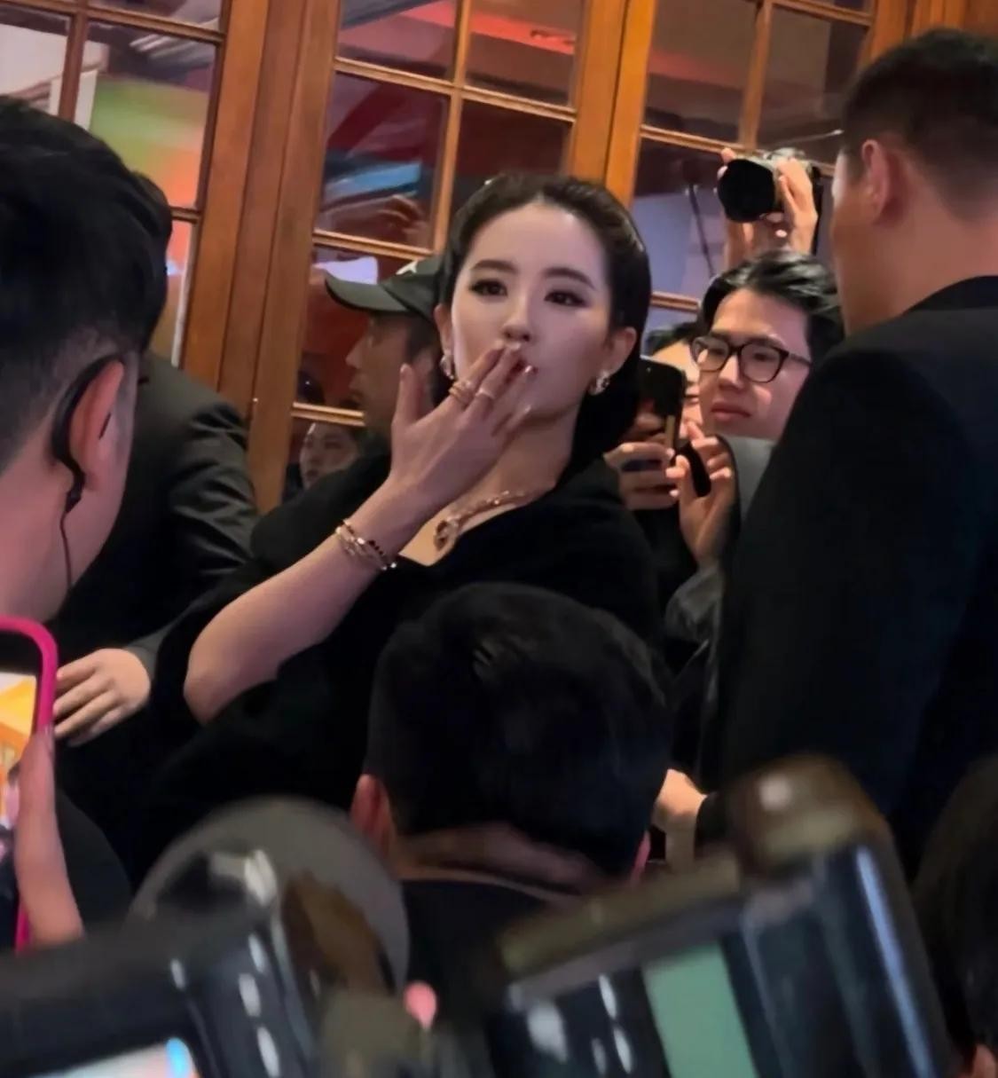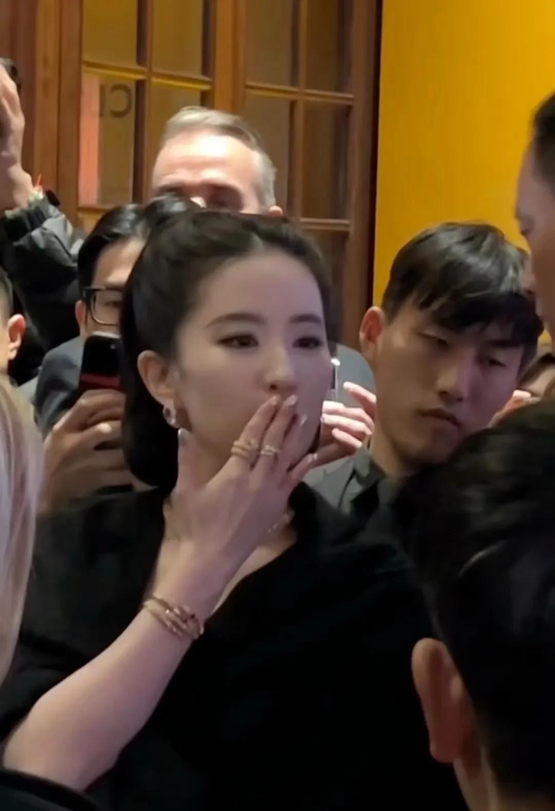 刘亦菲被人群簇拥着,她回眸的瞬间很美,她大方的朝大家飞吻,刘亦菲的表情很灵动。
