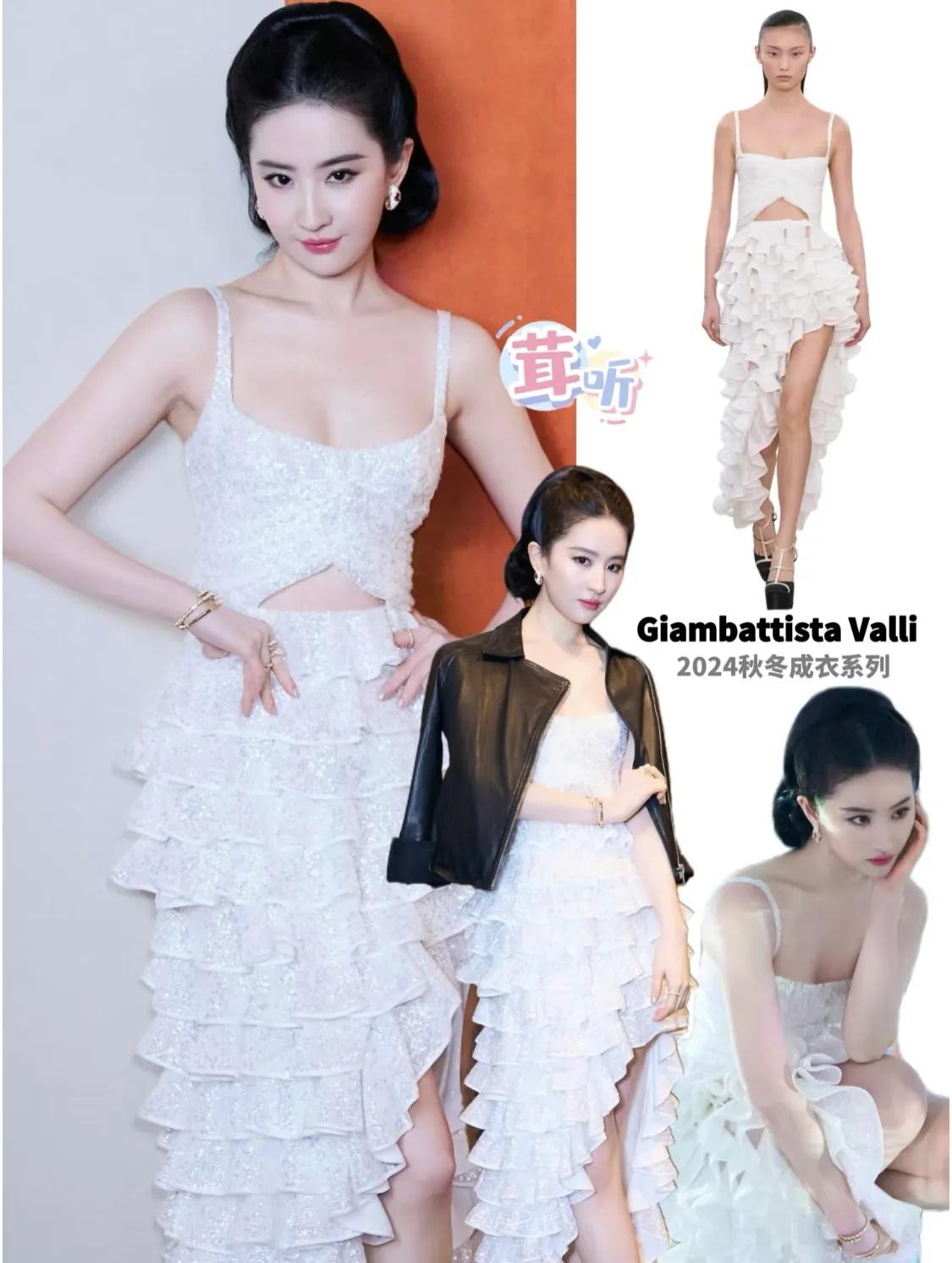 刘亦菲换的第二套礼服是一件白色的Giambattista Valli蓬蓬纱礼服,她穿这条礼服简直就是从海外留学归来的白秀珠。她的盘发和纱裙让她整个人复古又时髦,她穿白色比穿黑色更美。