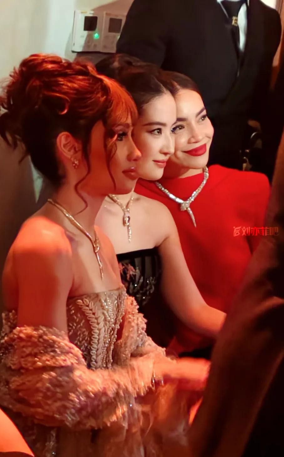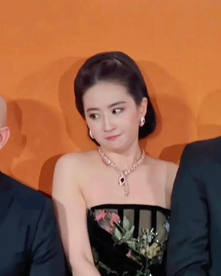 刘亦菲被宝格丽高层挤在中间,起因是她给安妮海瑟薇让了一点位置,但是这让她没地儿站了。于是,被挤在中间的刘亦菲露出可爱的表情,这尴尬的瞬间被她轻松化解了,这个女人俏皮又可爱。