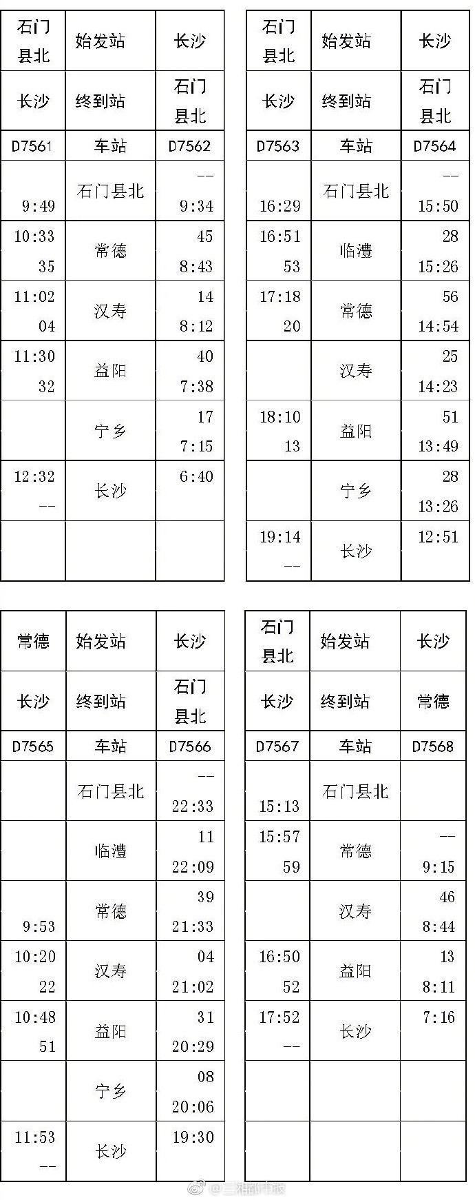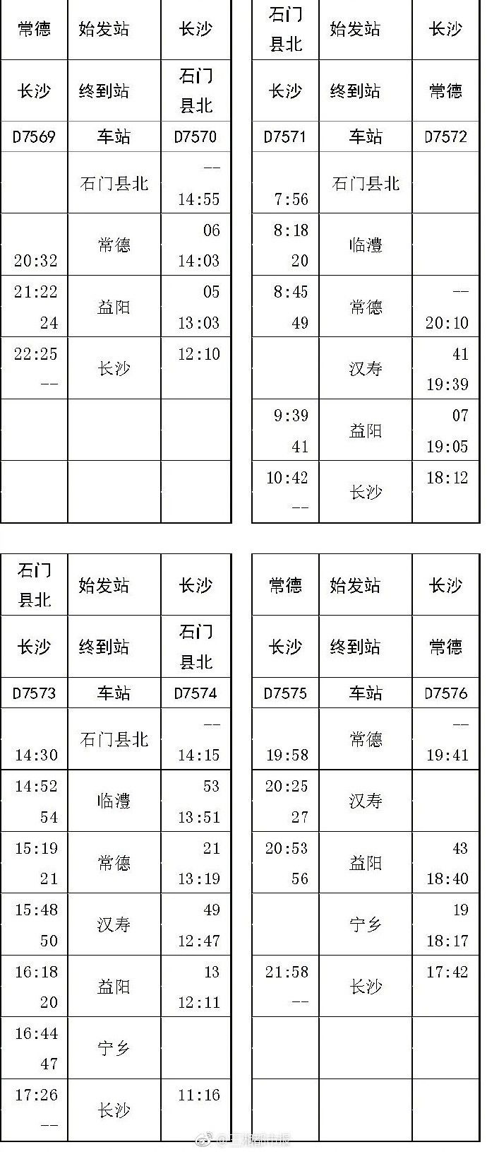 按照铁路部门9月21日开始实施的新列车运行图安排,石长铁路每天将开行8对动车组列车,其中长沙至石门县北站间开行D7562/1次、D7564/3次、D7566/7次、D7570/1次、D7574/3次5对动车,长沙至常德间开行D7568/65次、D7572/69次、D7576/5次3对动车。