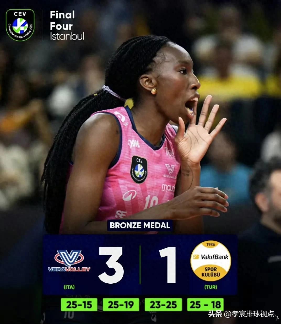 5月4日深夜,24~25赛季女排欧冠季军战,米兰3-1(25-15 25-19 23-25 25-18)力克瓦基弗银行收获季军。