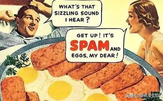 1937年,有一个叫Jay Hormel(荷美尔)的美国人,用香料和火腿做成了一种罐头类的食物,起名叫Spam(斯帕姆罐头)。