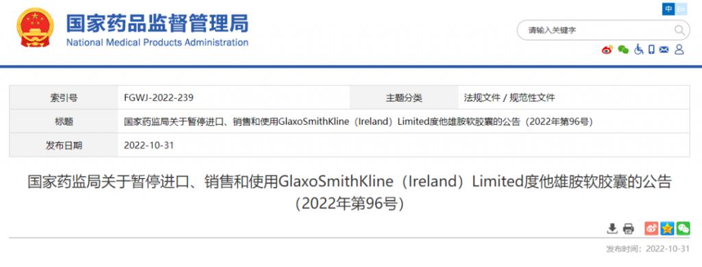 根据《中华人民共和国药品管理法》有关规定,国家药监局决定,自即日起暂停进口、销售、使用 GlaxoSmithKline(Ireland)Limited 度他雄胺软胶囊。各药品进口口岸药品监督管理部门暂停发放上述产品的进口通关单。