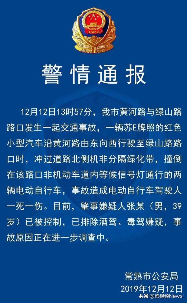12月12日13时许,江苏苏州常熟黄河路与绿山路路口发生一起交通事故,一辆苏E牌照的红色小型汽车沿黄河路由东向西行驶至绿山路路口时,冲过道路北侧机非分隔绿化带,撞倒在该路口非机动车道内等候信号灯通行的两辆电动自行车,事故造成电动自行车驾驶人一死一伤。