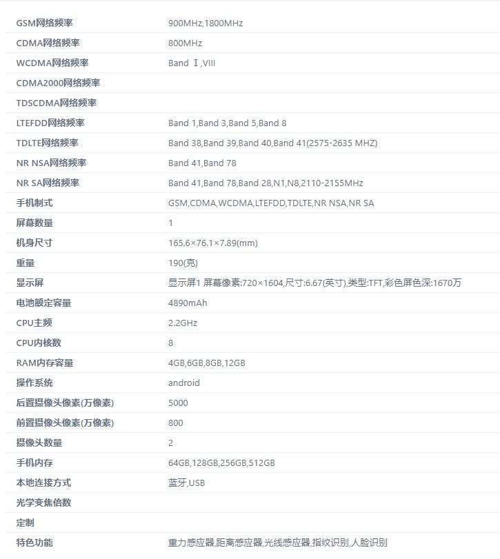 这款新机机身尺寸为 165.6 × 76.1 × 7.89(mm),重量为 190 克,正面配备 6.67 英寸 LCD 屏幕,分辨率 1604*720 ,后置 50MP 镜头,前置 8MP 镜头,电池额定容量 4890mAh,提供侧边指纹解锁、用于扩展存储的 microSD 卡插槽。