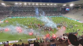 2021/2022法甲联赛附加赛次回合比赛中,圣埃蒂安主场点球大战不敌欧塞尔降入法乙。愤怒的主队球迷在点球大战结束后冲下看台,试图攻击自家球队的球员。