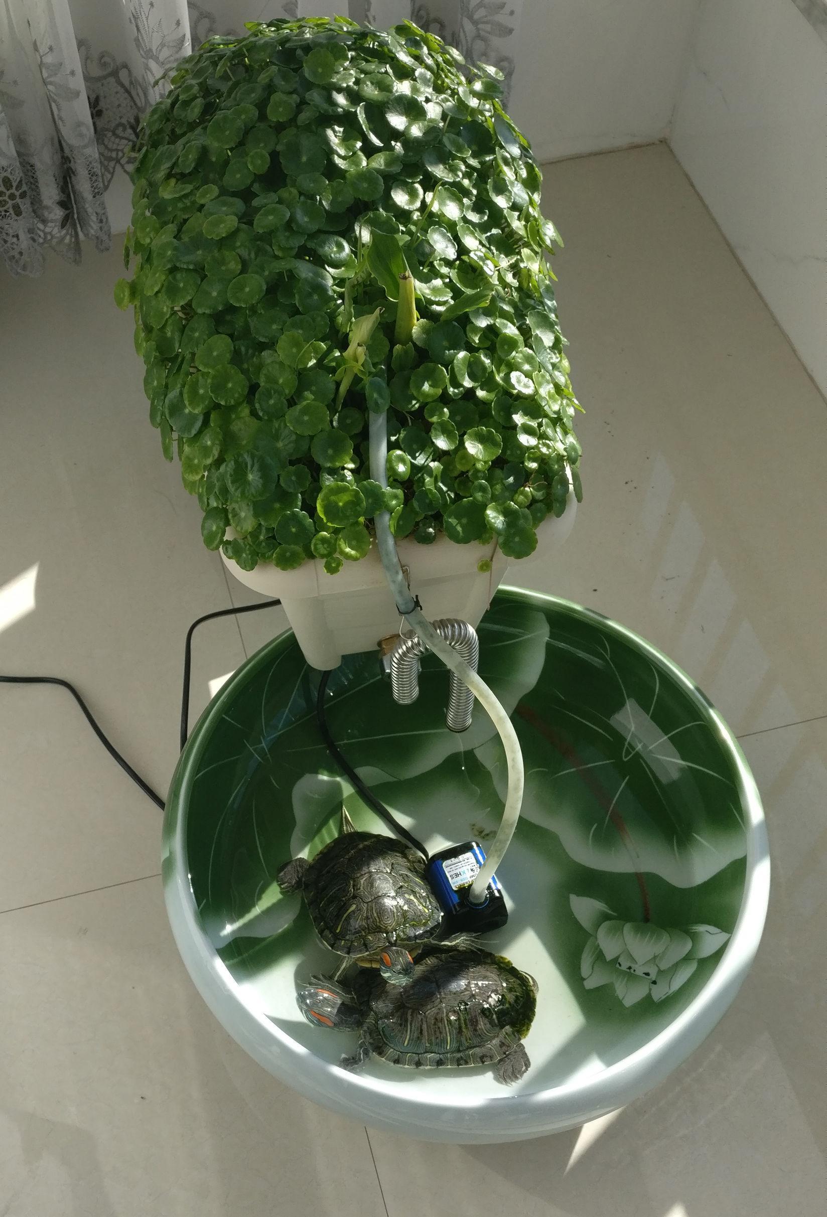 一年前在阳台上养了两只乌龟,以前经常要换水,自从用了这个再也不要换水了,每天加一点水就可以了。原理:通过水泵把水抽到上面的花盆中,在通过用不锈钢波纹管做的虹吸管把水排除去,花盆内的水位产生潮汐效应使植物的根部得到充足的氧气,防止烂根。同时植物的蒸腾作用使室内空气得到滋润。