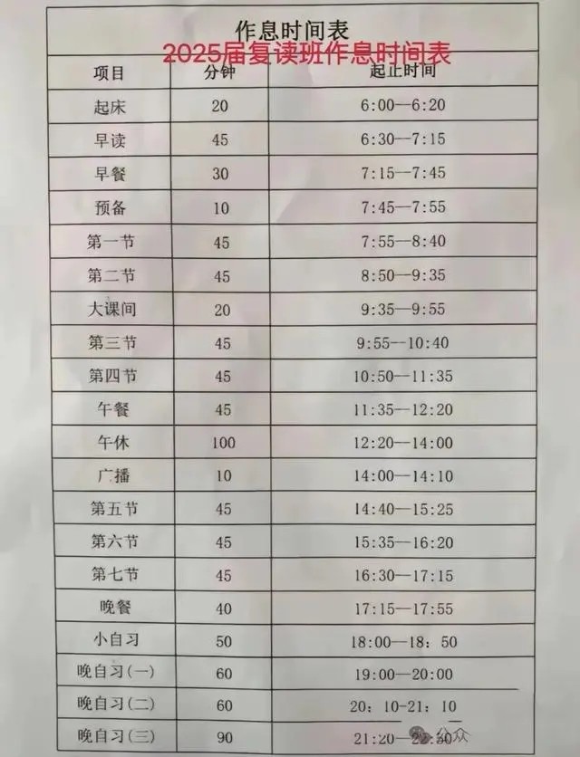 所以,毛坦厂复读学校的作息其实还不算夸张,毕竟中午还有100分钟的午休时间,如果考生能够科学安排好时间,也基本上能保持一个较好的学习状态。