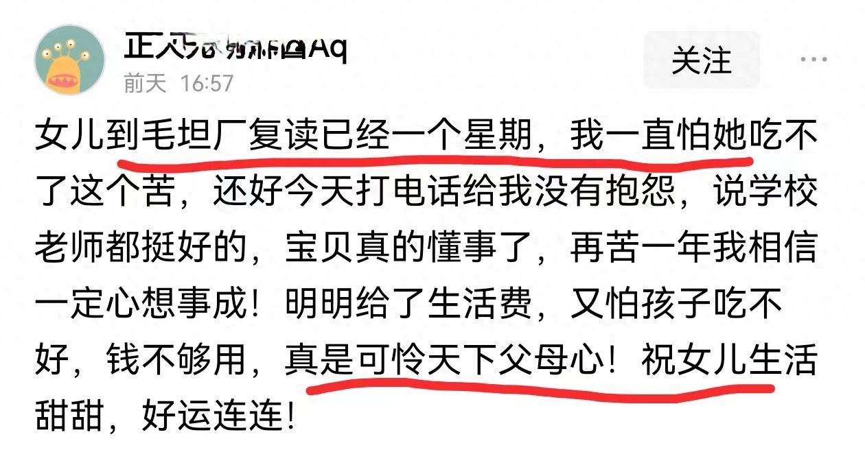 可怜天下父母心,纵有千山万水,工作缠身,为了孩子考上理想的大学,很多家长放弃了一切跑到毛坦厂陪孩子复读,相信那些经历过的人一定是感同身受。