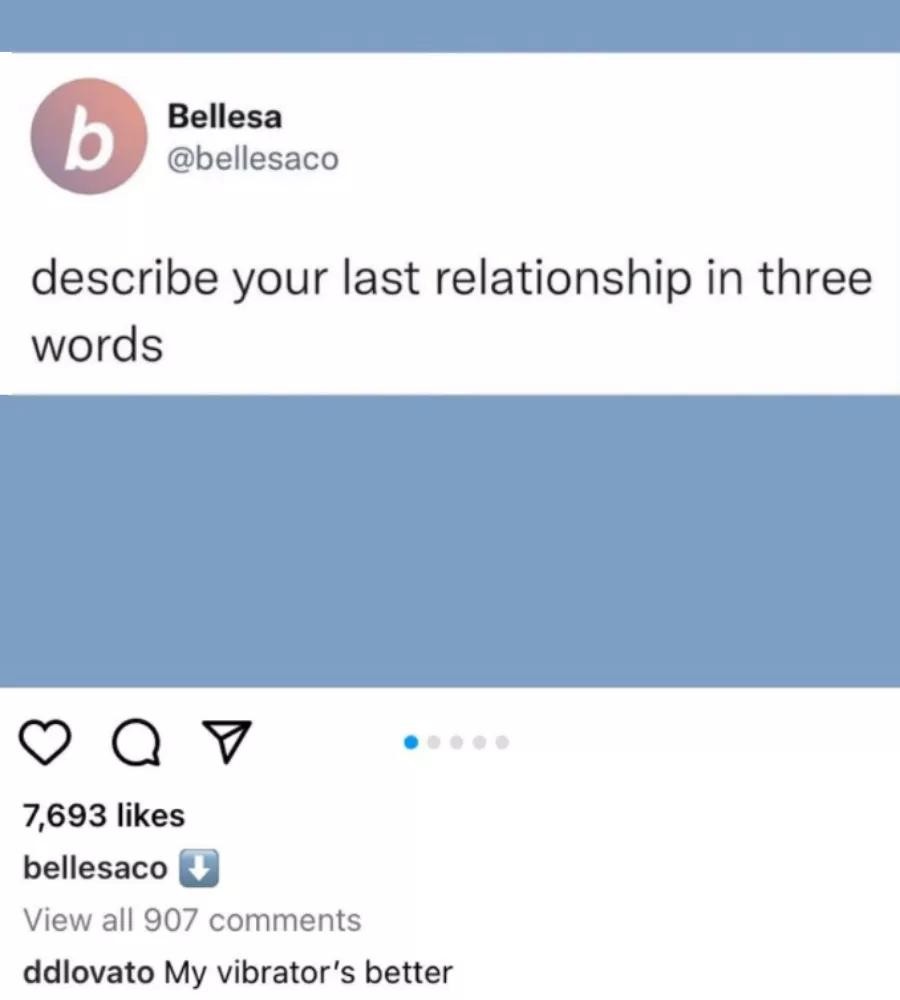 而 Demi Lovato(黛米·洛瓦托)也参与了互动,并用了三个词语形容自己的前男友 Max Ehrich(麦克斯·艾里奇),而这三个词语则是“My Vibrator's Better”。