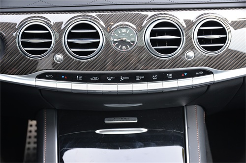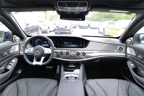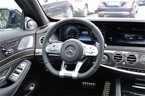 内饰方面,奔驰S级AMG的档次感相当突出,中控台造型舒展,各种高档材质的运用强调了整体的豪华氛围,碳纤维饰板的加入也体现出AMG车型的血统。双联屏被很好的融合在中控台之中,体现出奔驰强大的设计感,盘身厚实且带上了AMG标识的平底方向盘,同样强调了其不同的身份。