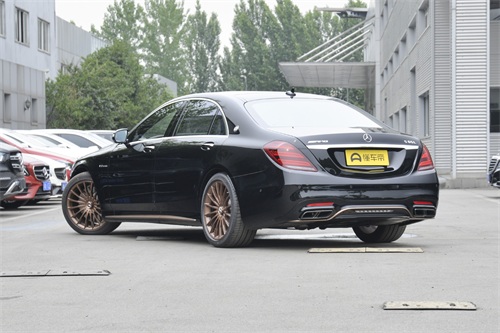 车侧部分造型相当修长,红色的密辐式轮圈成为了视觉焦点。车尾处,左上角的AMG标识和右上角的S65标识强调了其身份象征,双边的双边共四出排气布局造型相对优雅,体现出一种“西装暴徒”的美学概念。