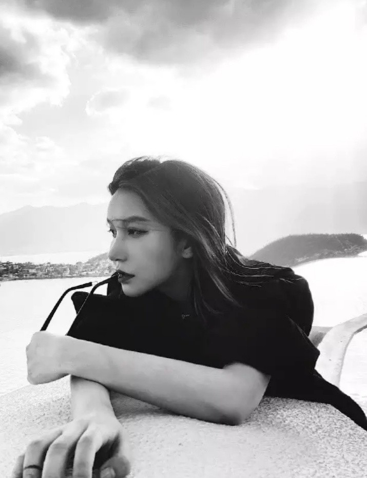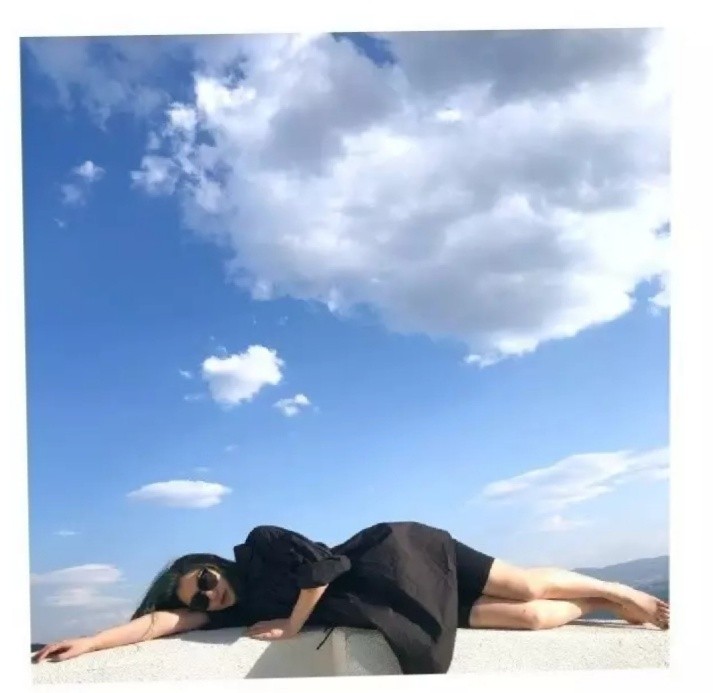 李雨桐的单人照都是以男友角度拍摄的,李雨桐侧躺看向镜头,背后是蓝天白云,看起来别有一番风味。