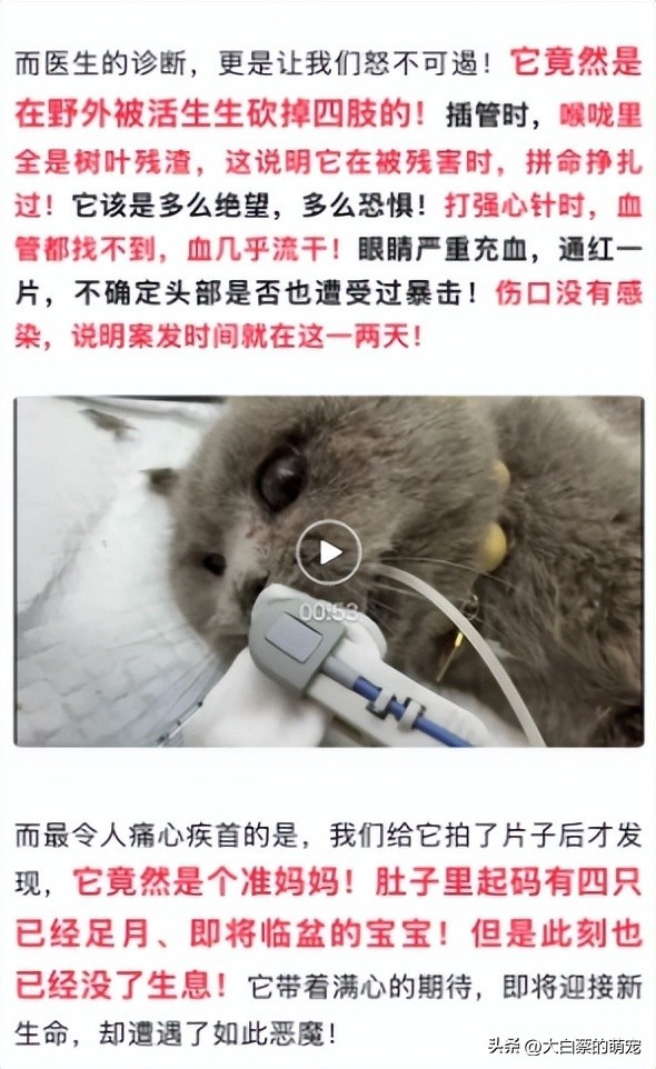 2025年4月25日,某百万粉丝博主发文称,在上海市浦东新区莲溪路地铁站附近一小区草坪上,发现一只奄奄一息的蓝猫,不仅四肢被砍断,头部还有打击伤,猫咪眼部充血,疑似是从高楼上掉下来的,于是这位博主马上联系宠物医院,将猫咪送医抢救,而让他更惊讶的是,这只蓝猫居然怀有身孕,后经宠物医院抢救无效死亡,猫咪腹中胎儿也未能存活。