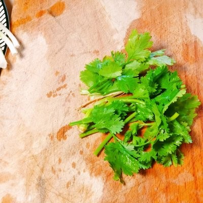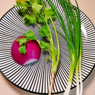 1、准备半个洋葱、一棵香菜、三棵葱洗净备用