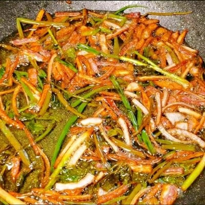 11、锅内放入适量油 油温七八成热放入我们准备好的洋葱、香菜、小葱,小火慢炸。
