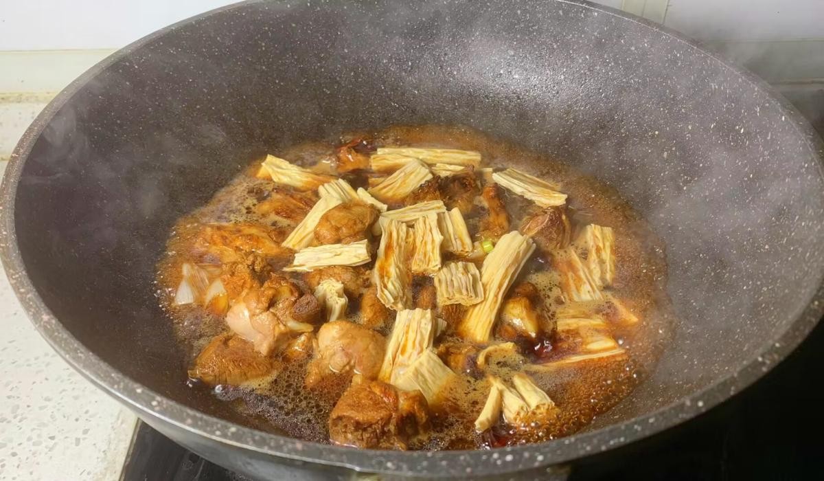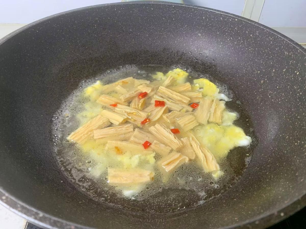 小李一边说着,一边等待着水烧开。当水开始冒出细小的气泡时,他将腐竹轻轻地放入锅中。随着腐竹在水中煮沸,水面上涌起一层浅浅的白沫。