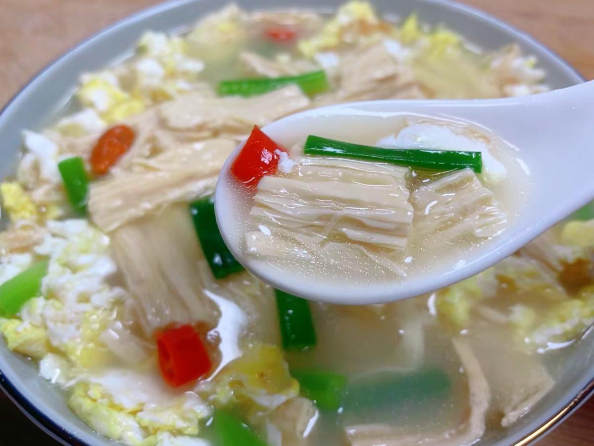 “记住,煮的时间不宜过长,否则腐竹会失去口感。三分钟后,关火,捞出腐竹,用凉水冲洗一下,就可以了。”