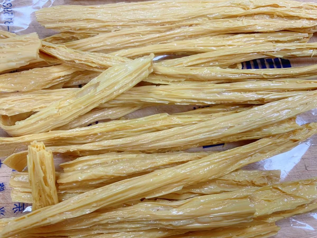 小李将煮好的腐竹取出,放在案板上,用刀轻轻切开,露出里面的鲜嫩肉质。