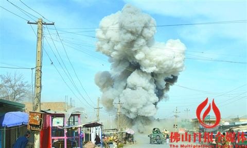 2月10日,在阿富汗北部昆都士省,爆炸发生地点升起浓烟。/新华社发