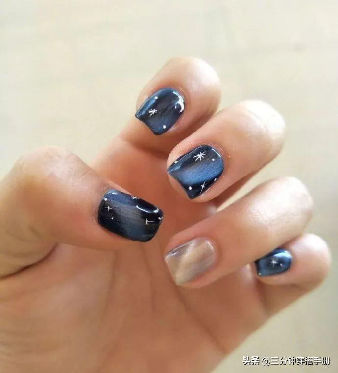 同样是深色系的美甲,星空蓝相对没有那么高冷,而是一种神秘美好的感觉。气质十足的配色,如果再加上一些金属亮点缀就更好了,适合喜欢浪漫的小女生。