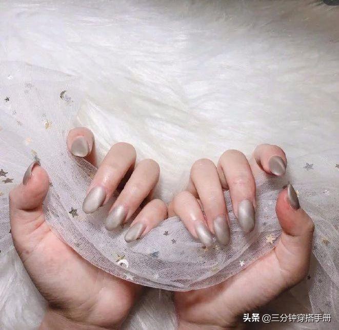 猫眼美甲在灯光的照射下,会有种猫眼石的效果,带有一条银色的粗线。独特的设计让猫眼美甲高级感十足,基础款都气质满分。看似高级其实操作起来很简单,只需要多加入一样叫做磁石粉的东西,再用磁石棒一吸,就能营造出猫眼美甲的效果。