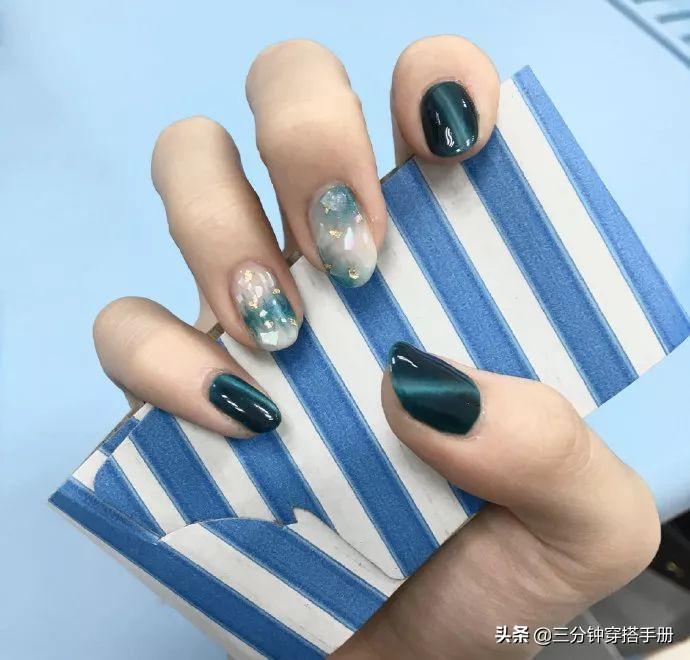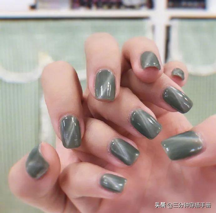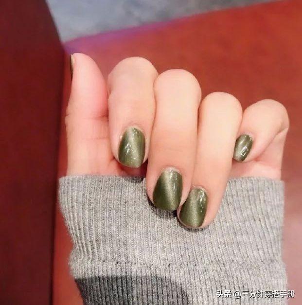 墨绿色的猫眼美甲算是最常见的一种,大概因为这也是大多数猫咪的眼睛颜色,自带高冷的距离感。墨绿色对于肤色没有太大的挑剔,就算是黄皮星人也能轻松驾驭。