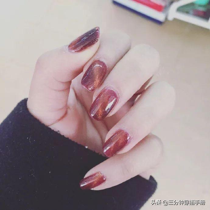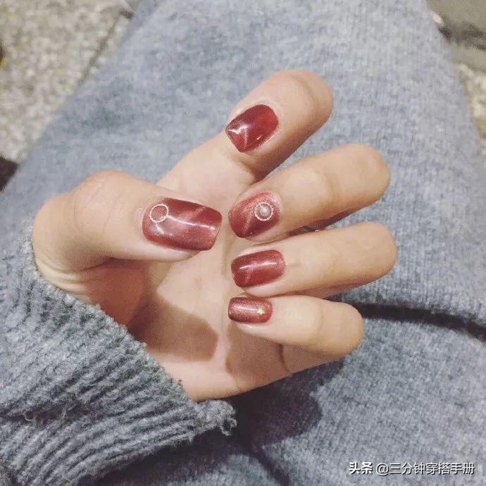 暗红色不管是在服装上还是美甲中,都是比较的配色,完成的效果绝对魅惑十足。只是小女生选择深紫色的猫眼美甲略显老气,推荐更加成熟的女性尝试。