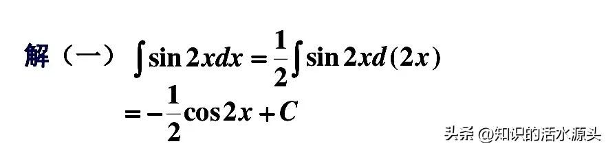分析:对于该例题一共有三种解法,第一种解法,我们在求解时,可以采用以上的换元法进行转化,可以另u=2x,那么就可以将式子进行转换,则sin2x=sin u,然后再根据配凑法进行配平即可。凑1/2d(2x)=dx