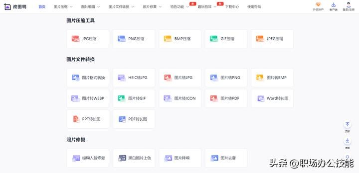 一个综合的图片编辑处理在线工具,它里面有图片编辑、图片压缩、图片格式转换、照片修复、智能证件照、照片特效、AI绘画等多种功能,不需要注册登录,打开就能使用。