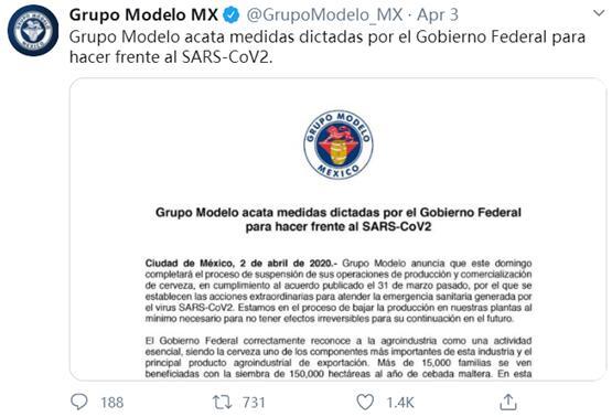 莫德洛集团在推特上发表的一份声明中表示,由于墨西哥政府已经关闭了非必要的商业活动,所以该公司正在停止其啤酒生产和销售。