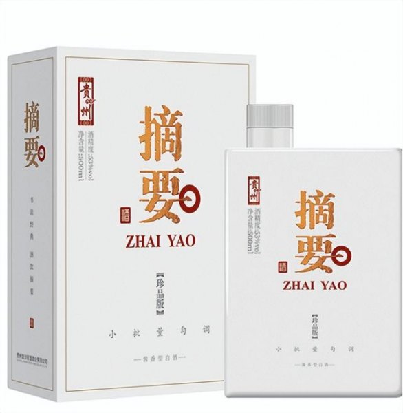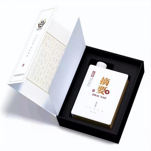 摘要酒在包装上也极具艺术性,不管是宴请、送礼还是收藏都能够显示品位。它的盒子外形是长方体形状,乍看起来就像一本厚厚的著作,有浓厚的文化气息。颜色以白色为基础,给人雅致、秀气之感,两个宋体的鎏金大字“摘要”位于包装正中央,简洁明了。
