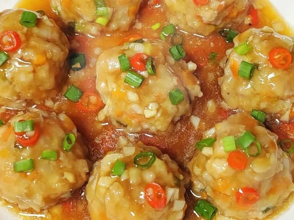 5、起锅烧油,油热后放入蒜末和小米辣炒出香味,再放入提前备好的酱汁煮开,煮至粘稠状态,就可以出锅淋在丸子上,撒上葱花即可上桌开吃。