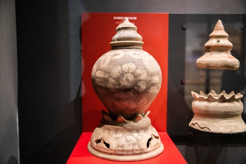 在统万城出土的塔式罐因形似塔状而得名,创烧于唐代,图案有卷云纹、宝相花、仰覆莲等。