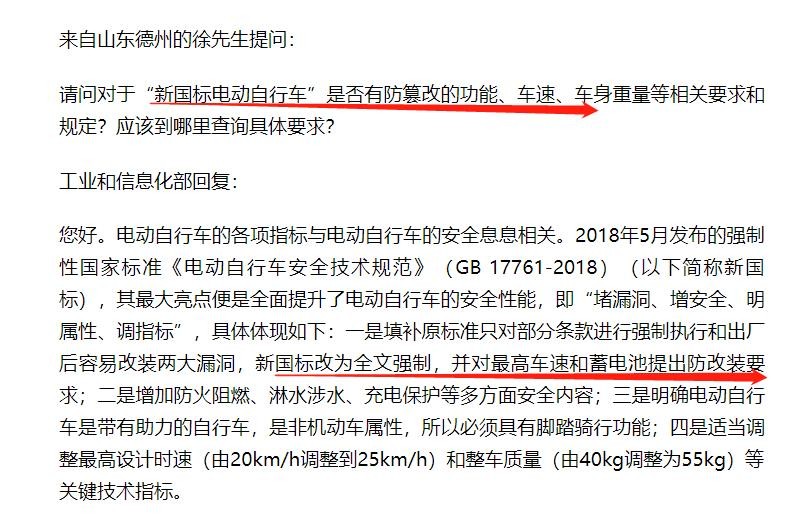 1、 电动车新国标具有强制要求的防篡改功能,小行家找到2021年工信部对于网友咨询,新国标电动车是否具有防篡改的功能、车速、车身重量要求的规定,工信部明确答复:新国标改为全文强制,并对最高车速和蓄电池提出防改装要求。