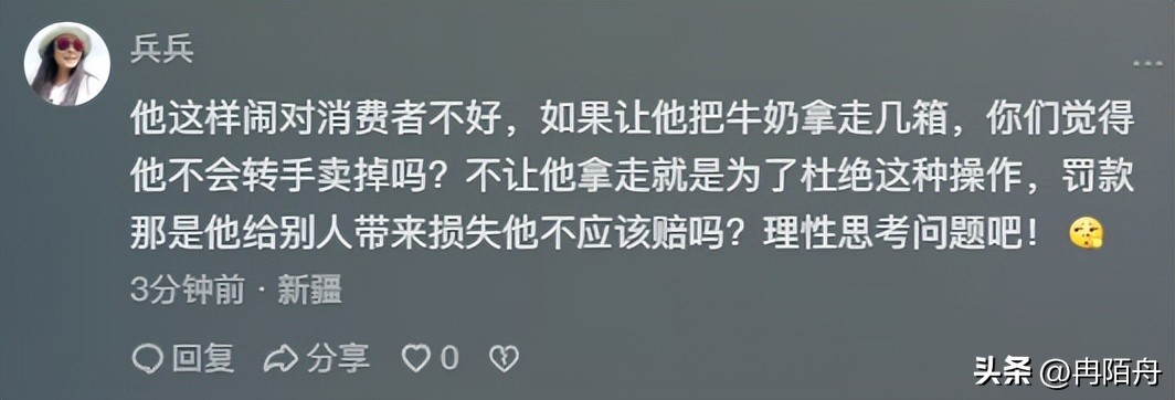 他这样闹对消费者不好,如果让他把牛奶拿走几箱,你们觉得他不会转手卖掉吗?不让他拿走就是为了杜绝这种操作,罚款那是他给别人带来损失他不应该赔吗?理性思考问题吧!