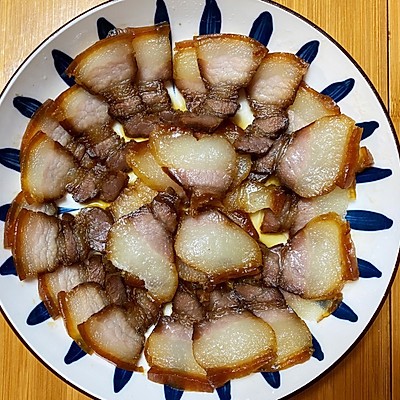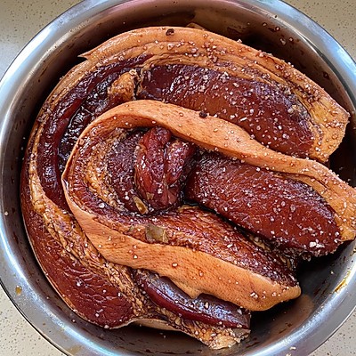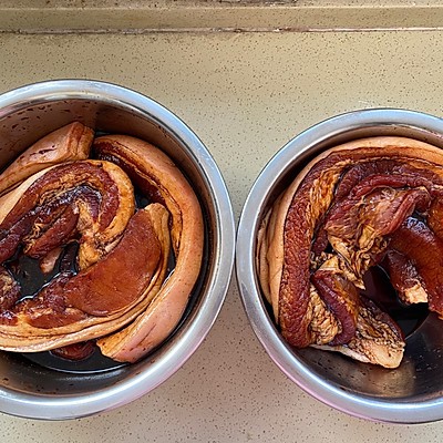五花肉(腌制) 5kg盐(腌肉用) 150g高度白酒 适量花椒 适量八角 3个桂皮 适量香叶 3片生抽 适量老抽 适量味极鲜 适量白糖 适量