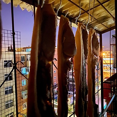 13、视天气和温度情况晾晒几天,至腊肉风干且不硬即可,我晒了六天。