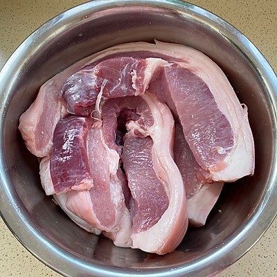 1、买来的五花肉让店家刮干净肉皮上的毛,切成2-3厘米宽的长条。