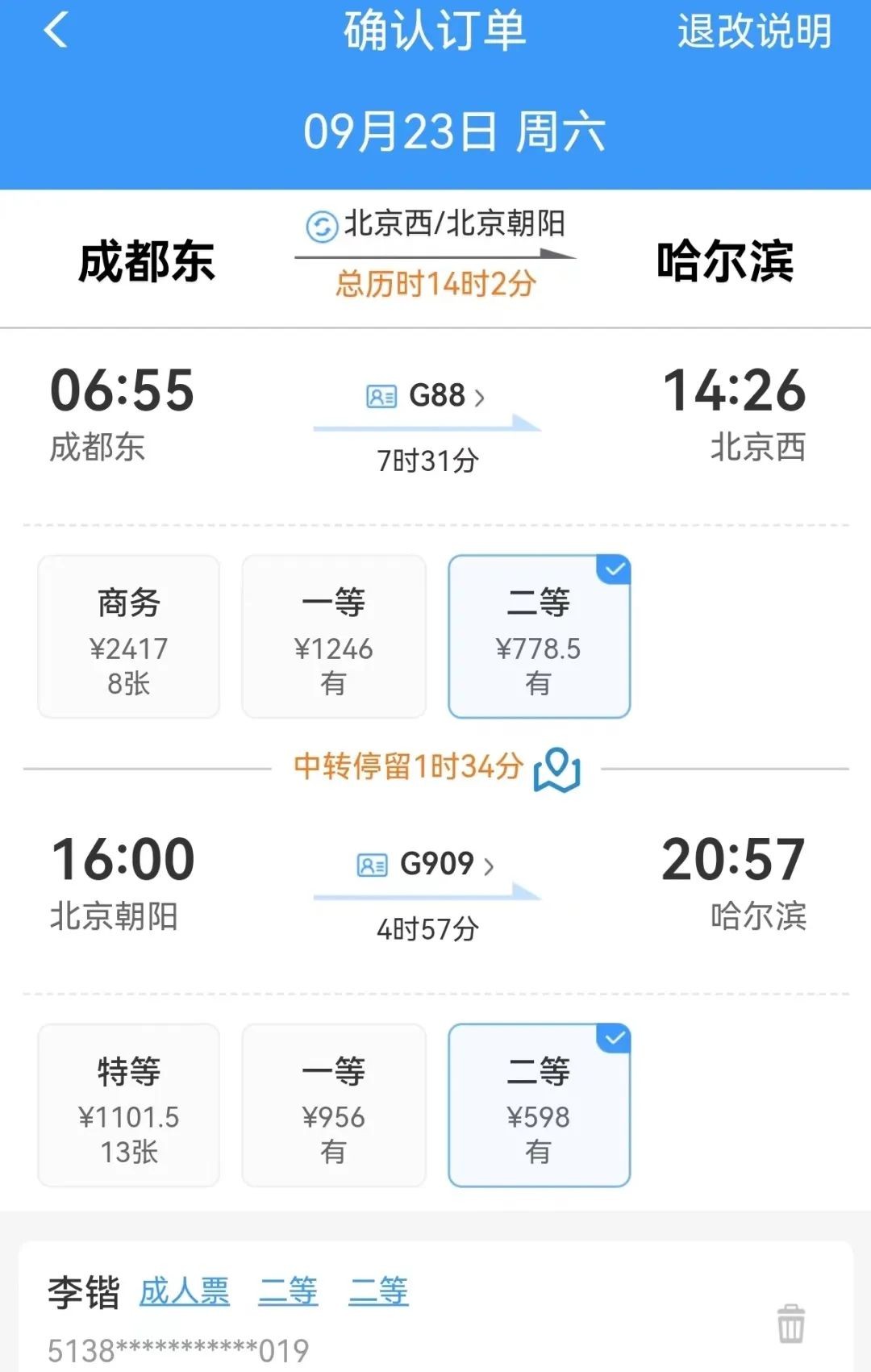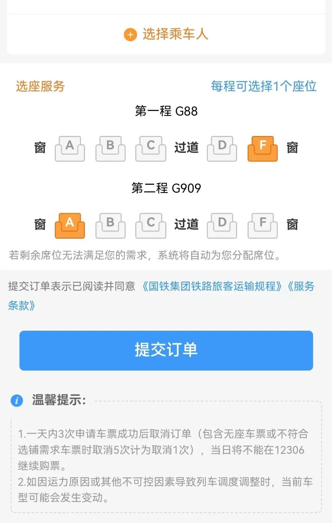 若方案符合出行需求,只需点击“同意”后,选择座位级别、添加乘车人和座位即可。