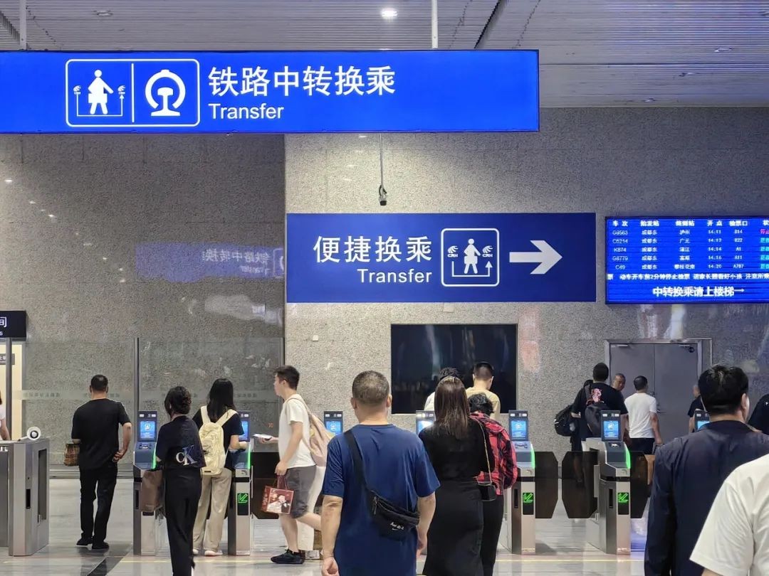 因各车站中转换乘通道设置不同,旅客在换乘时,需注意查看站台各处引导标识或询问车站工作人员,避免走错通道,耽误后续换乘车次。