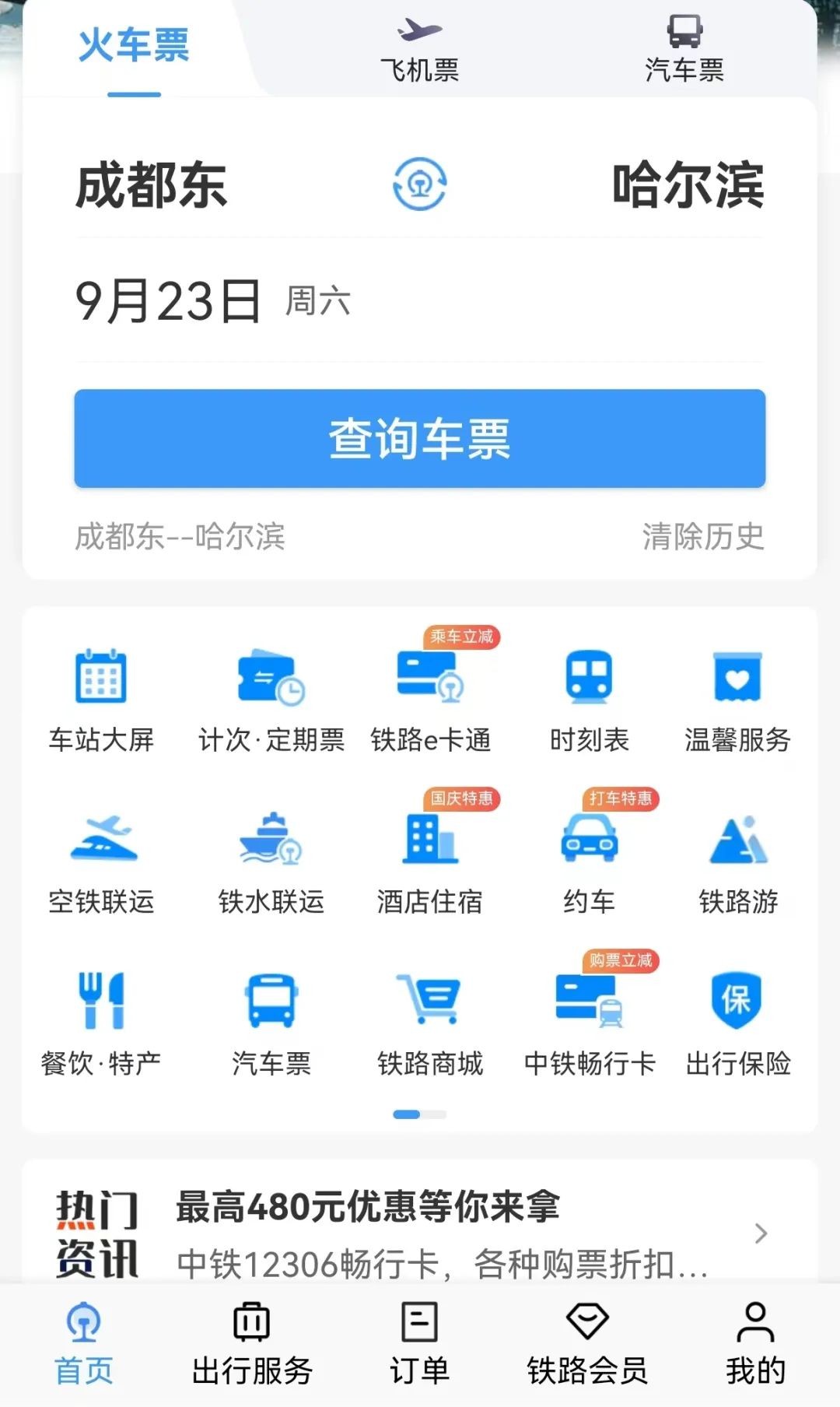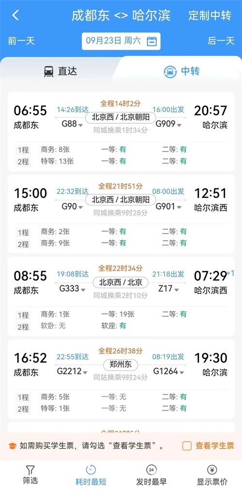 进入铁路12306App,选择所乘区间和日期,以成都至哈尔滨为例。