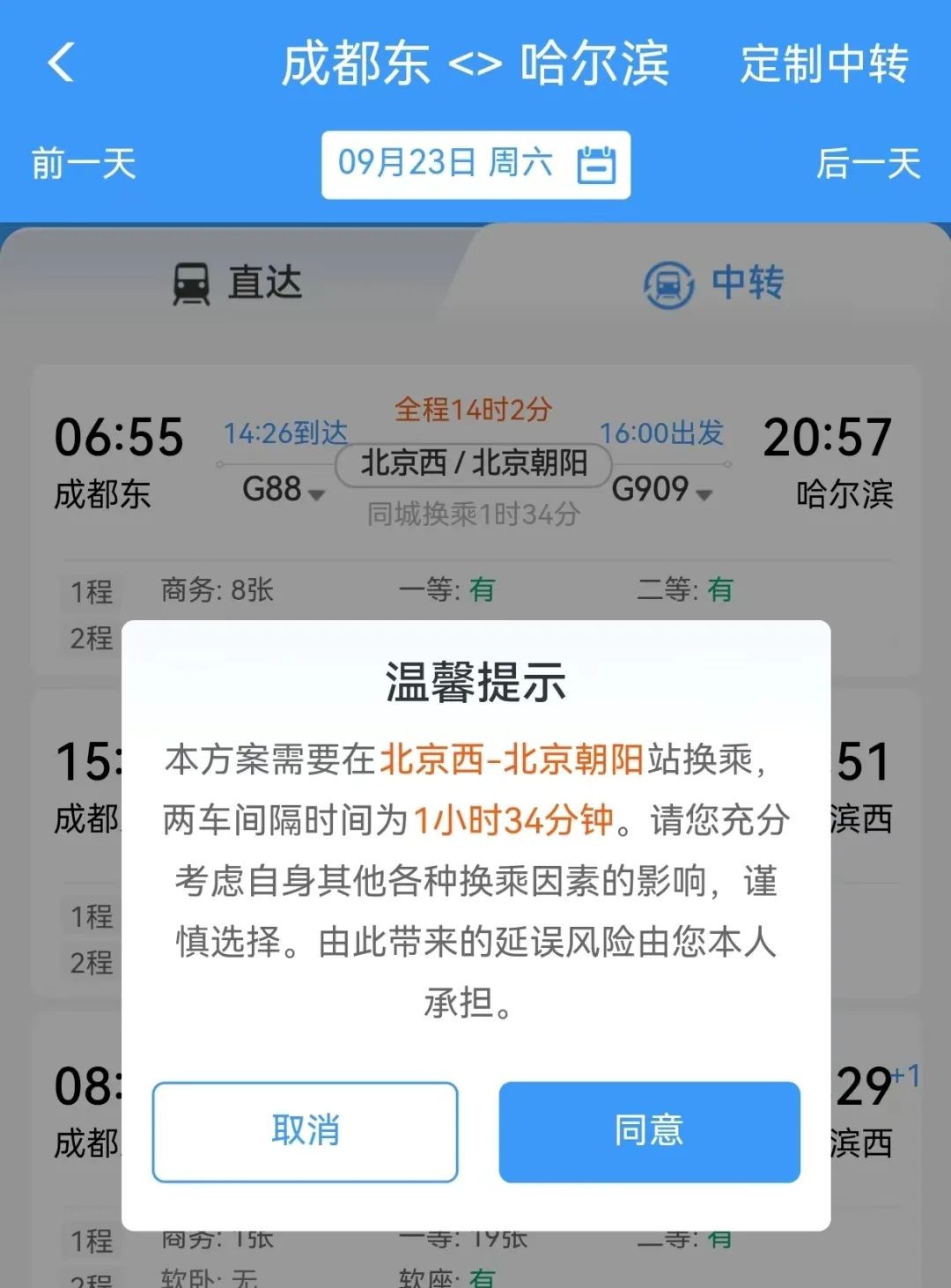 选择中转换乘方案时,会弹出温馨提示,显示换乘车站和两车间隔时间,请旅客充分考虑自身其他各种换乘因素的影响,谨慎选择。